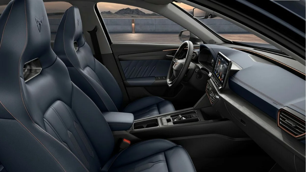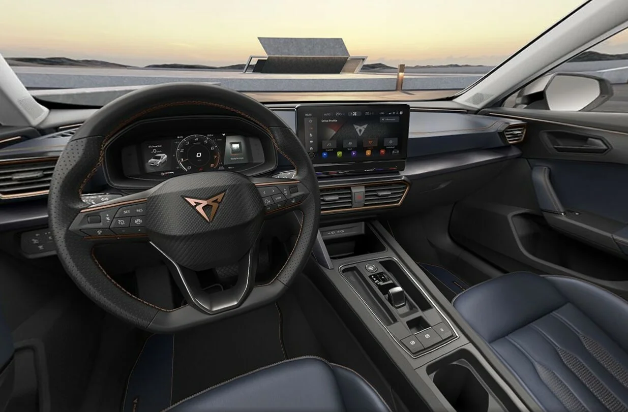 Kokpit skierowany do kierowcy, kubełkowe fotele oraz wielofunkcyjna, skórzana kierownica z logo Cupra zapewniają sportowe wrażenia podczas jazdy. Cyfrowy zestaw wskaźników i czytelny interfejs DSG tworzą przestrzeń, w której każdy detal wspiera prowadzenie i dodaje prestiżu.