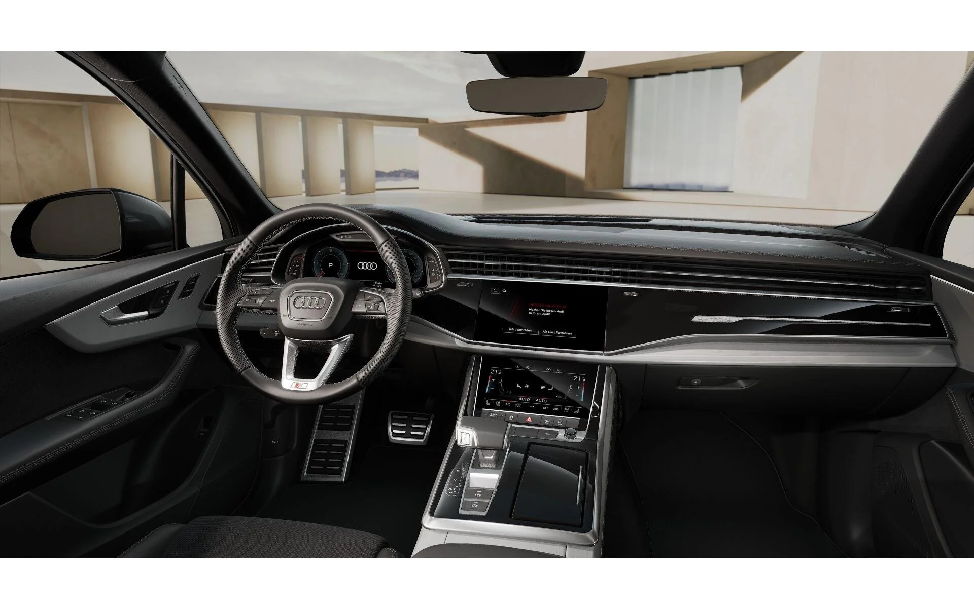Kabina Q7 w wersji S line to połączenie nowoczesnej technologii i luksusu. Wysokiej jakości materiały – mikrofibra Dinamica Frequenzy i skóra z logo S – nadają wnętrzu sportowego charakteru. Czterostrefowa klimatyzacja, podgrzewane i elektrycznie regulowane fotele z pamięcią ustawień oraz ambientowe oświetlenie tworzą przestrzeń, która relaksuje na każdym kilometrze.