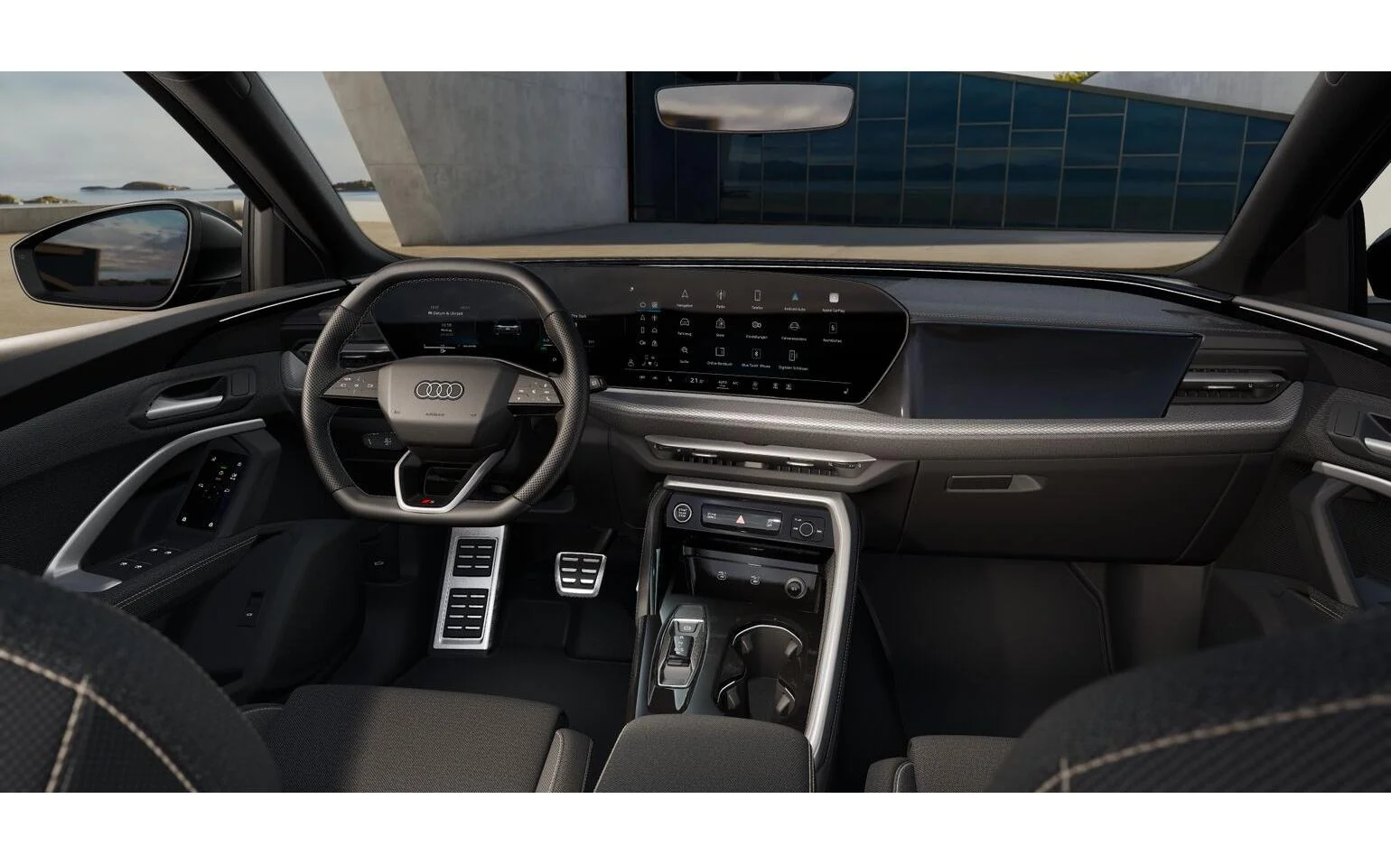 Wnętrze Q5 w wersji S line Interieur oferuje wysoki poziom dopracowania. Sportowe fotele z tapicerką Kaskade z pikowaniem w romby, czarna podsufitka i aluminiowe aplikacje tworzą nowoczesny, prestiżowy klimat. Kierowca ma do dyspozycji cyfrowy kokpit Audi Virtual Cockpit Plus, podświetlane listwy progowe z logo S oraz trójramienną sportową kierownicę obszytą skórą perforowaną.